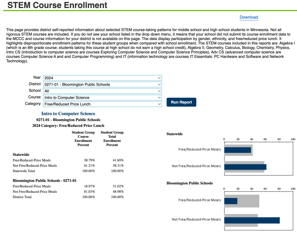 The Minnesota Department of Education (MDE) also provides two dashboards for STEM (Science, Technology, Engineering, and Mathematics) course availability and enrollment. The dashboards show availability and enrollment of a limited set of CS courses in three categories: