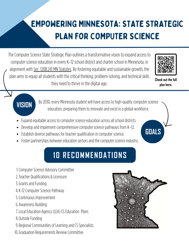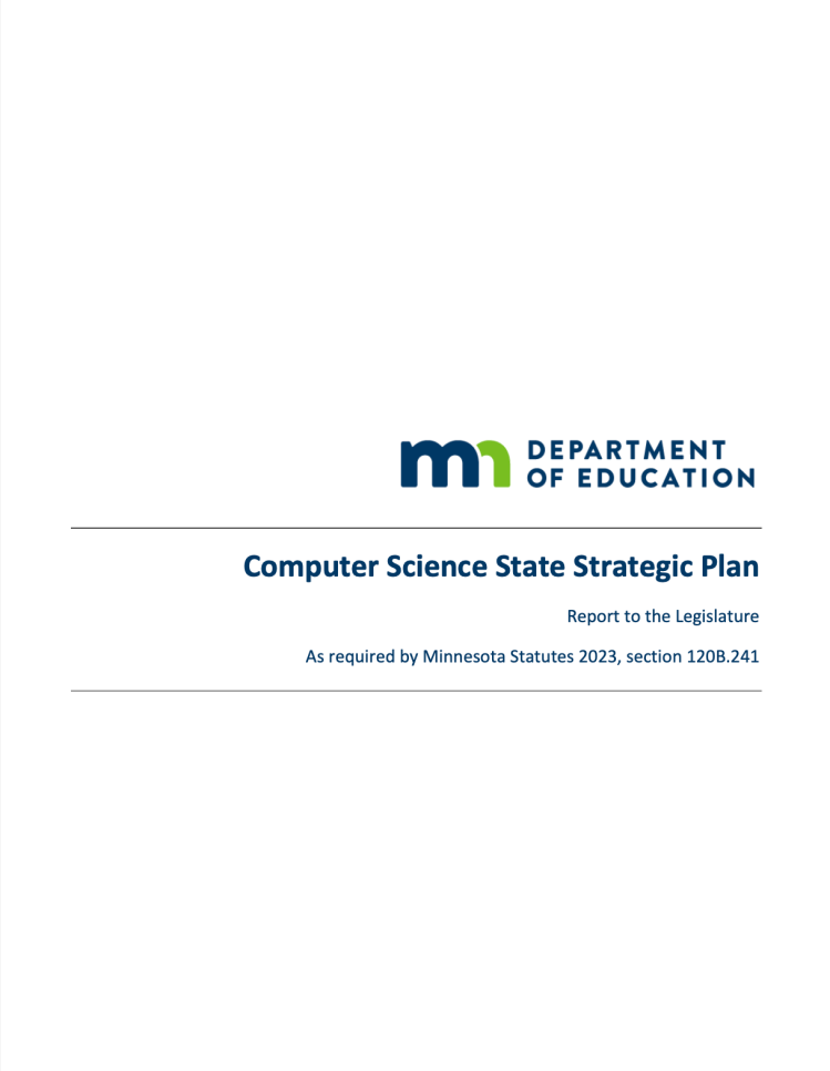 Minnesota’s Computer Science (CS) Working Group developed a state strategic plan for computer science, finalized in March, 2024, which describes ten recommendations for long-term and sustained growth of computer science education across all public K-12 and charter schools in Minnesota, as outlined in the Computer Science Education Advancement Act Minn. Stat. 120B.241 (2023). The recommendations are aligned to the requirements outlined in the legislation, such as licensure, high-quality professional development, continuous improvement, and standards, among others.